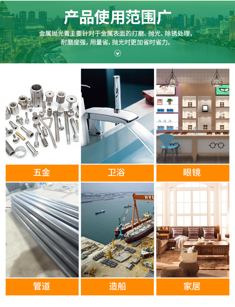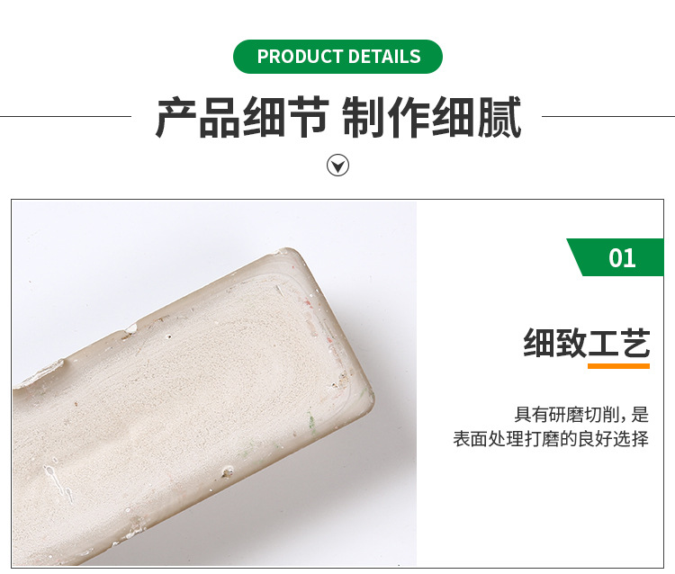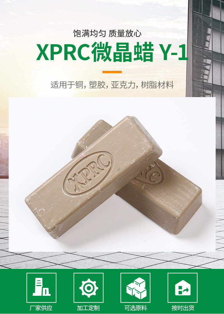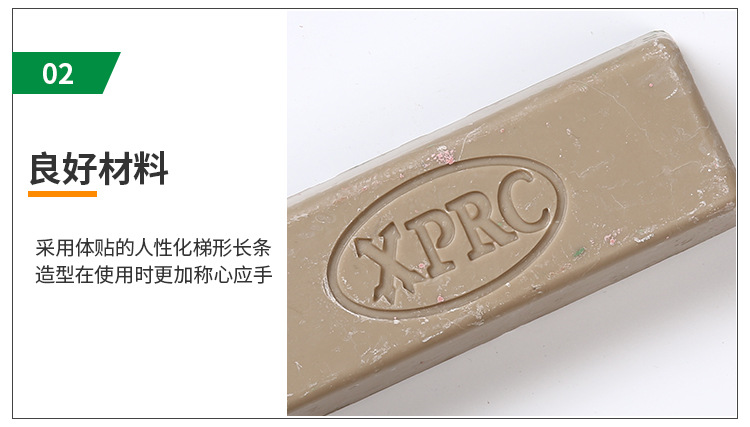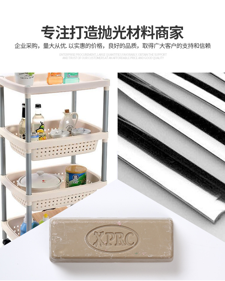 型號:5號黃臘。一般情況下用不同的顏色表示不同品種的拋光臘,避免使用時混亂。高含量的磨料可以加速整個拋光過程。這個過程是拋光臘拋光輪表面移動而使材料變得光滑。